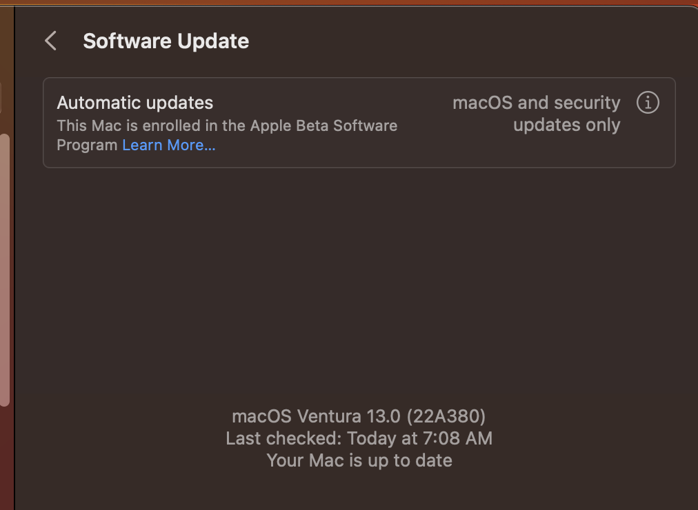 Thanks a bunch, says "No new software available".The officially released version is macOS Ventura 13.0-22A380.