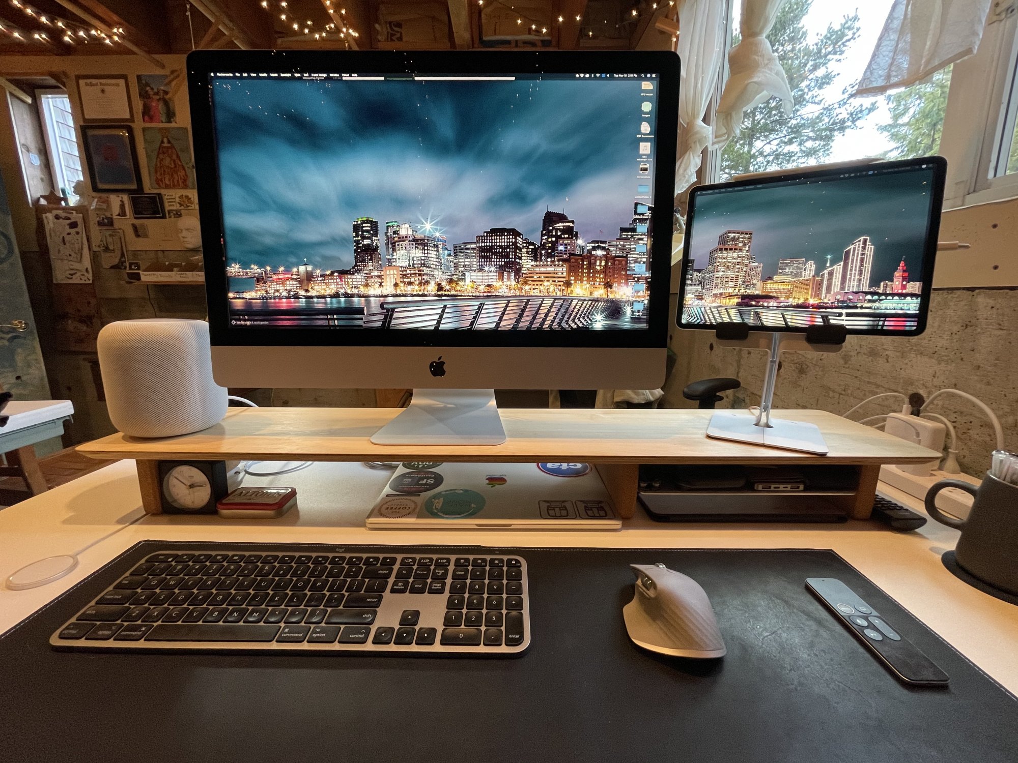 It's the 60 by 30 Vari Desk and a Grovemade stand. I figured if I was gonna be stuck in the house for over a year it might as well be nice.Really nice set up👍, this is why I need a bigger desk. Work set up ( Dell laptop & monitor ) on the left , then my personal corner on the centre/right with the Mx redesigned iMac 27” or 30”.