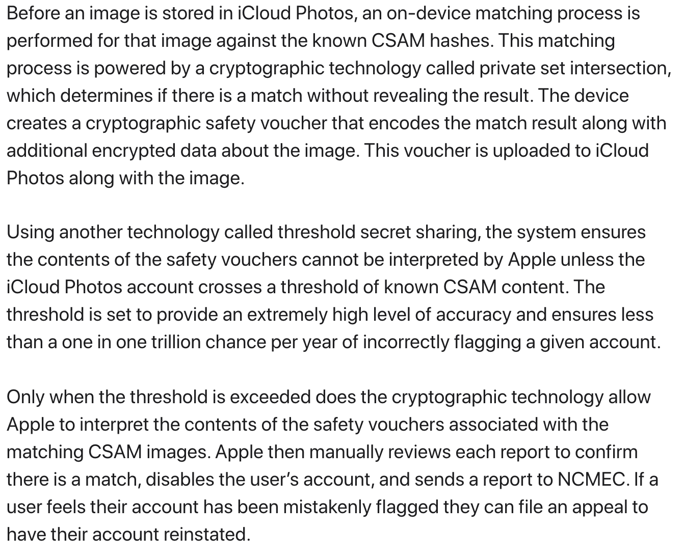 Anyway, as I said, I don't object to Apple scanning what I send to the cloud. I only object to my own device, my processing power, my battery, being used for that. My own device is doing extra work for them. That's not right.