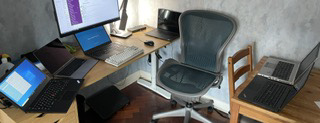 Here’s my desk to point out the shocking disparity in my Mac to pc ownership ratio. Test machines galore! Oh and my docked main workstation is a Dell…