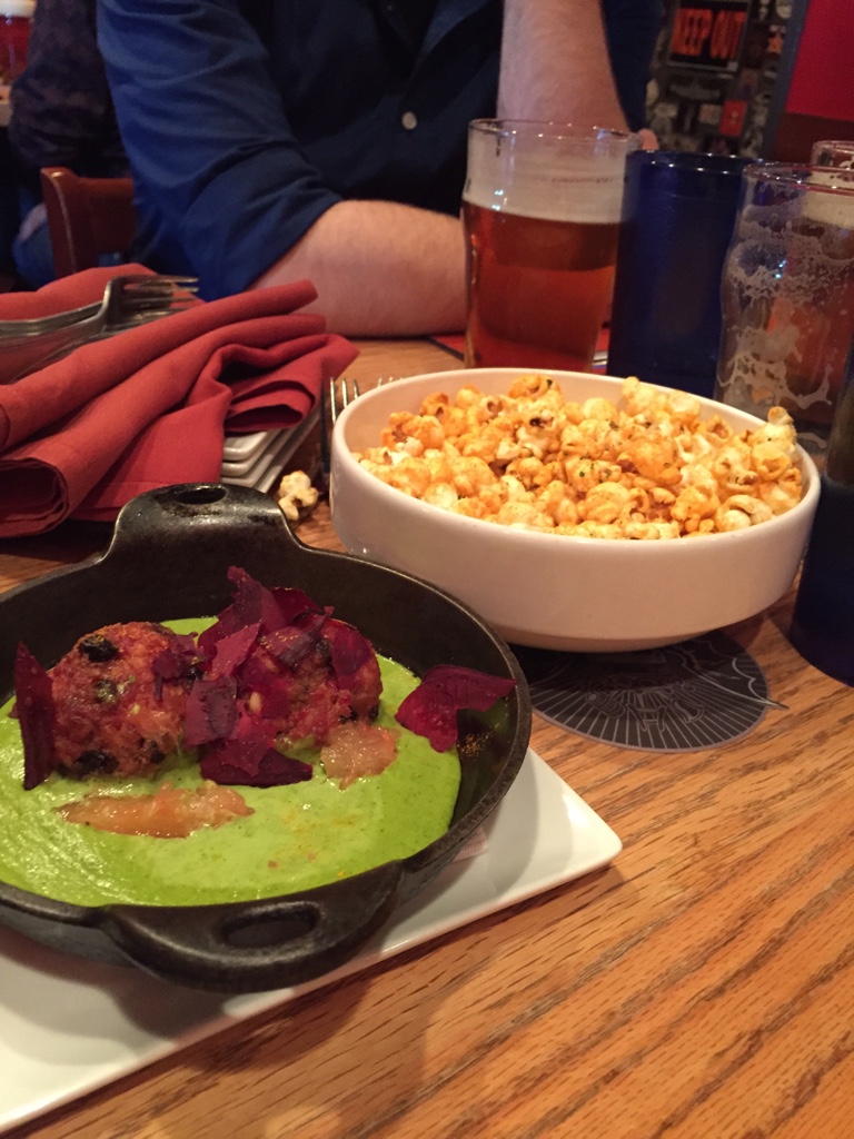 Lamb and currant meatballs. Popcorn with tobasco powder.