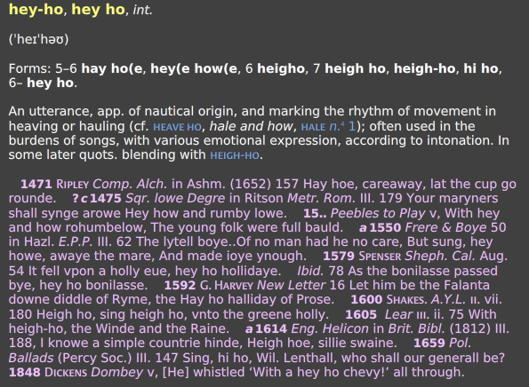 “Hey-ho”, as well, is used in many military chants and marching songs — all, no doubt, direct descendants from the English, Spanish, Dutch, and Portuguese militarizing of the high seas, post-1500.
