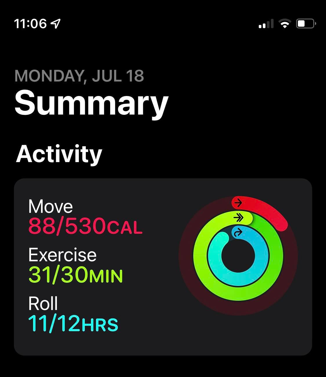 Well done. Each to their own, but I would just keep all of your activity levels as normal. Do nothing different for the first two weeks, and then you'll establish a baseline. You may or may not close your rings but that doesn't matter. You'll establish a baseline for all of those items and then from there you can set targets for growth.