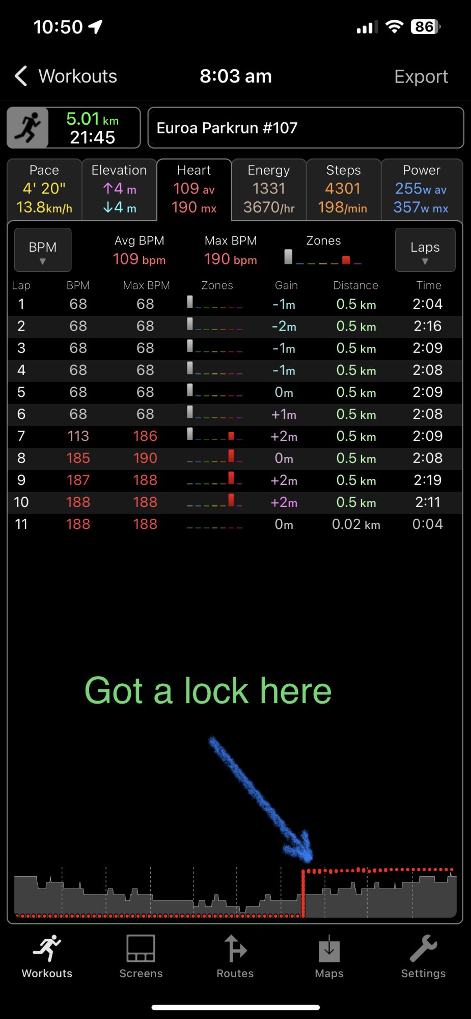 @cfc - I don’t think this is a sensor issue. This sounds like WOD not getting a HR lock at the start of a workout. My run this morning took 10 minutes to get its first reading. I can force it by doing a heart rate read with standard app and that often forces WOD to start recording it from that point. I suspect the change you are making in the next release to display the HR lock might fix this issue for