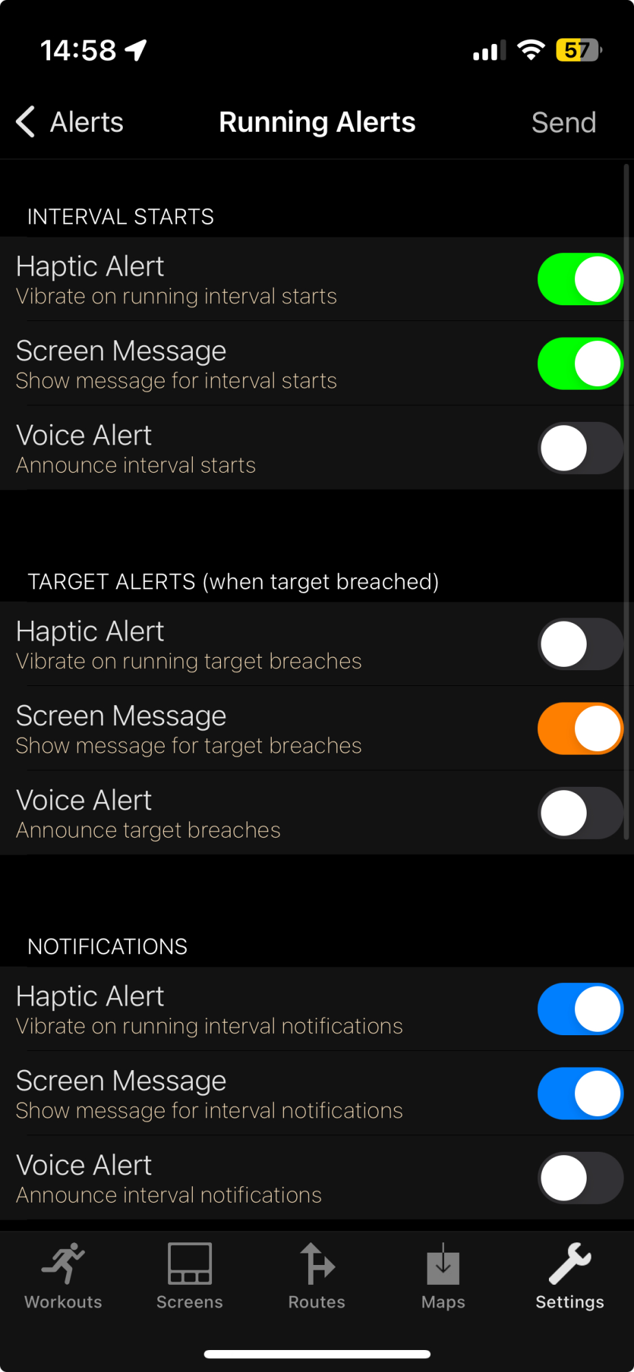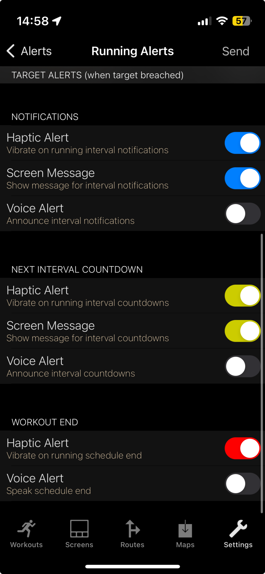 That’s strange. Sorry that I can’t help.I tested now, not running. I jumped to the recover interval and could feel the half way haptic alert that I enabled but not the countdown haptic alert. Actually, it does not vibrate on countdown even when it has the voice alert enabled.