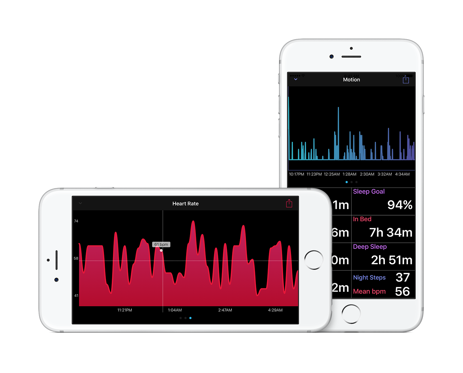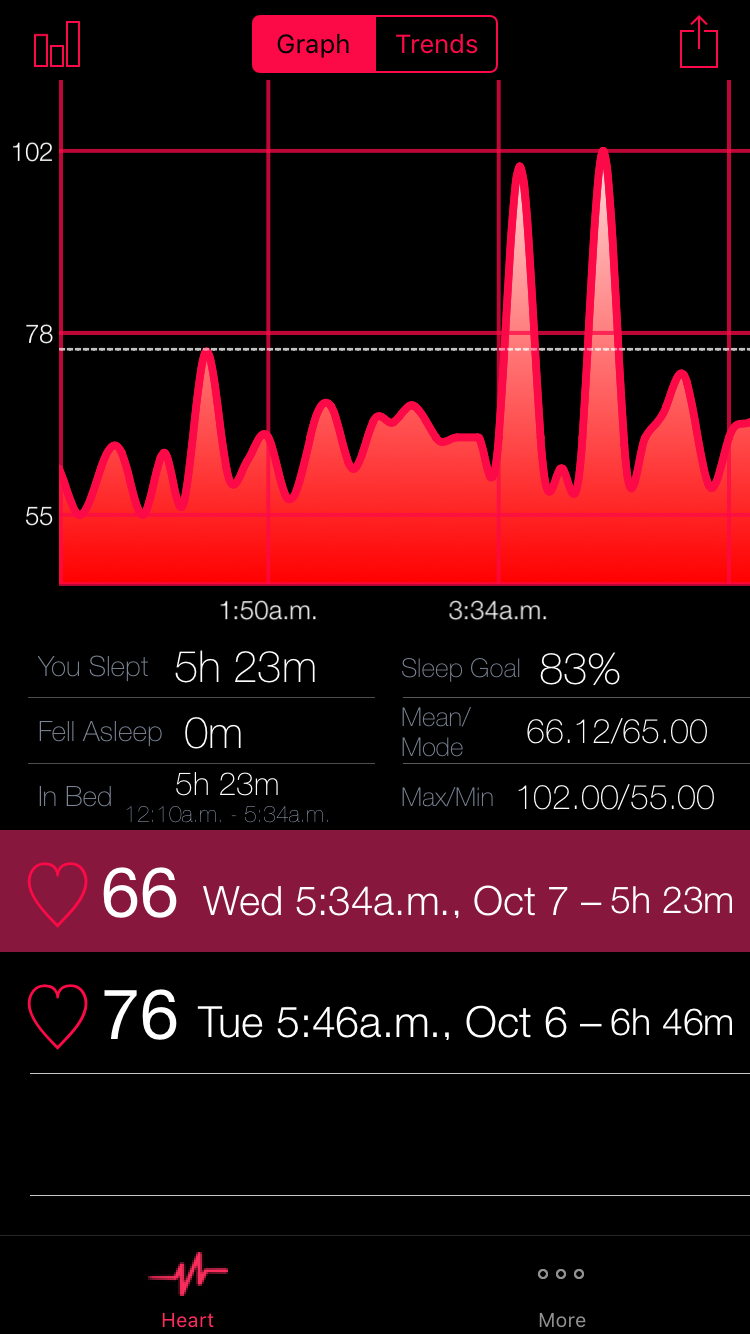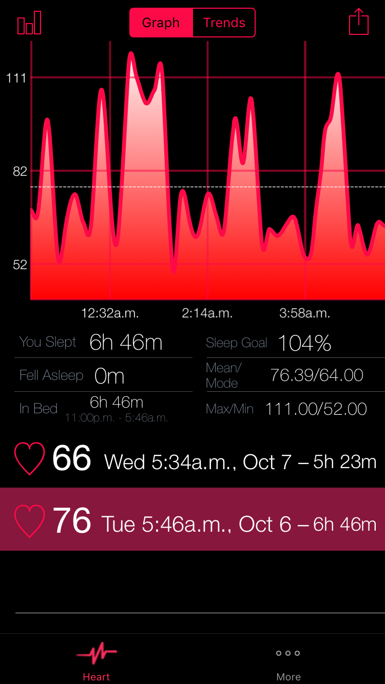 Though Sleep Pulse 2 Motion is still currently waiting review — for those with a new 6s iPhone I wanted to give you an idea how it will be used in the new update. Sleep Pulse 2 Motion includes two new graphs a Motion Graph and a Sleep Analysis Chart (as I am calling it) along with the Heart Rate graph because of this there are many representations of your sleep. For example on the Trends Chart view you will be able to peek into the actual motion graph of the night of data your looking at (you slept or fell asleep chart) though if you are instead looking at the mean bpm chart a peek will show you the heart rate graph. Then pop into either night if you choose. Below is a peek of a peek in SP2M.