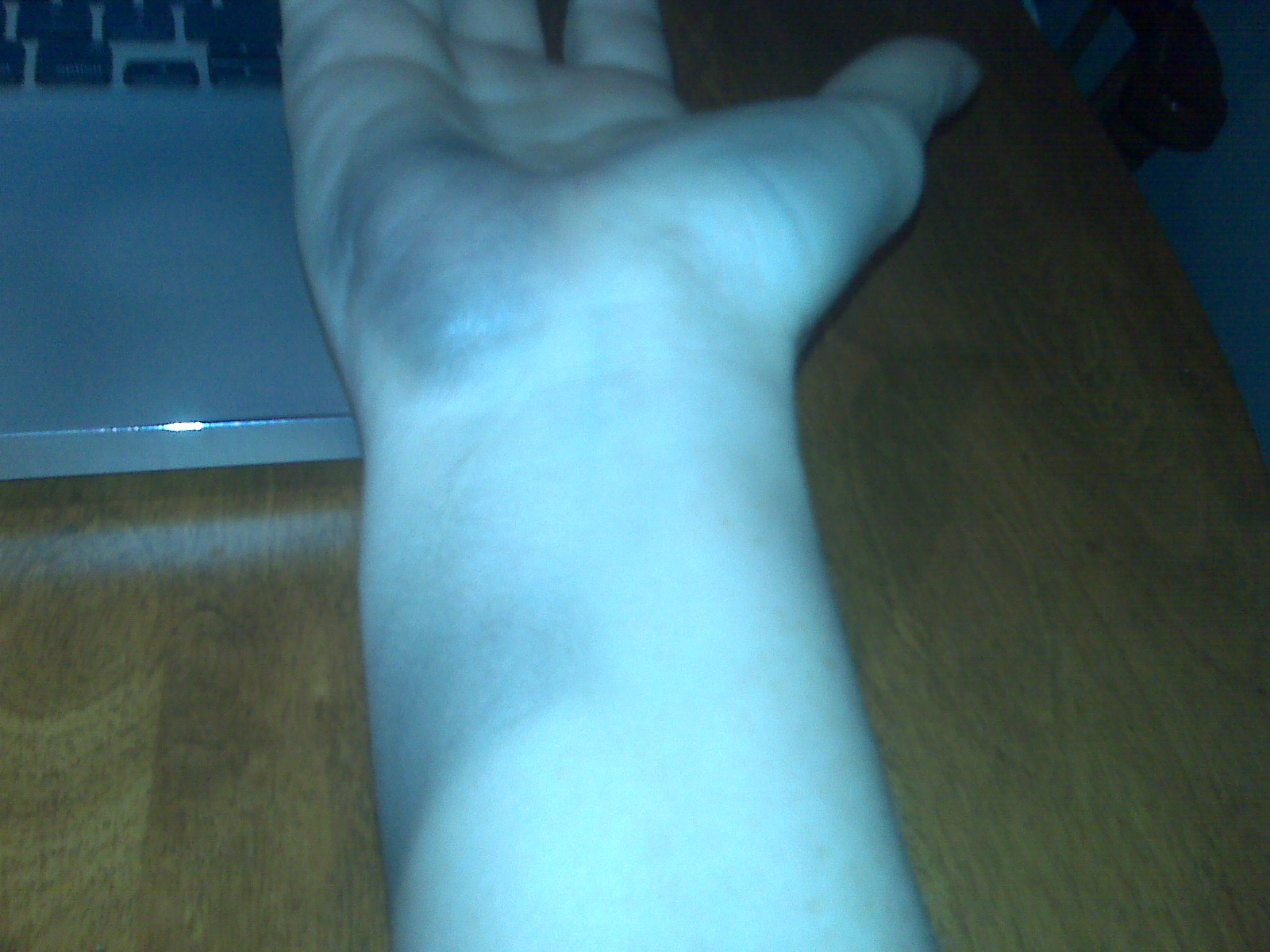 But I haven't seen many folks complaining about the result I experience: A black mess on the forearm and palm of my right hand. The bad blackberry photos of the edge and the dark marks don't do either justice, but they can give you an idea.