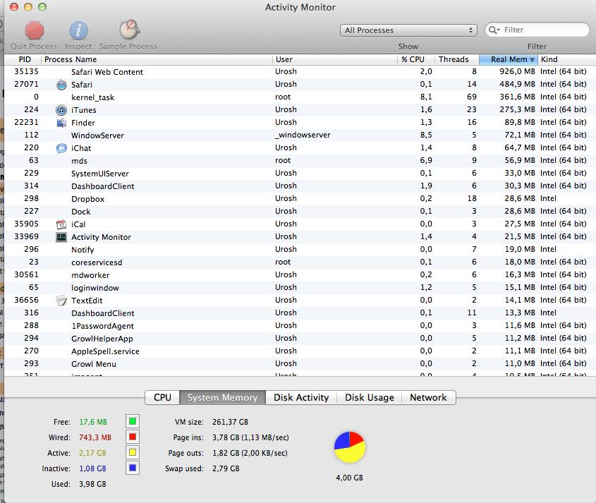 A little bit over 3 days uptime and used only: Safari (no flash!), iCal, Adress Book, MSN, Skype, iChat, occasional Chromium and ran Numbers once as well.