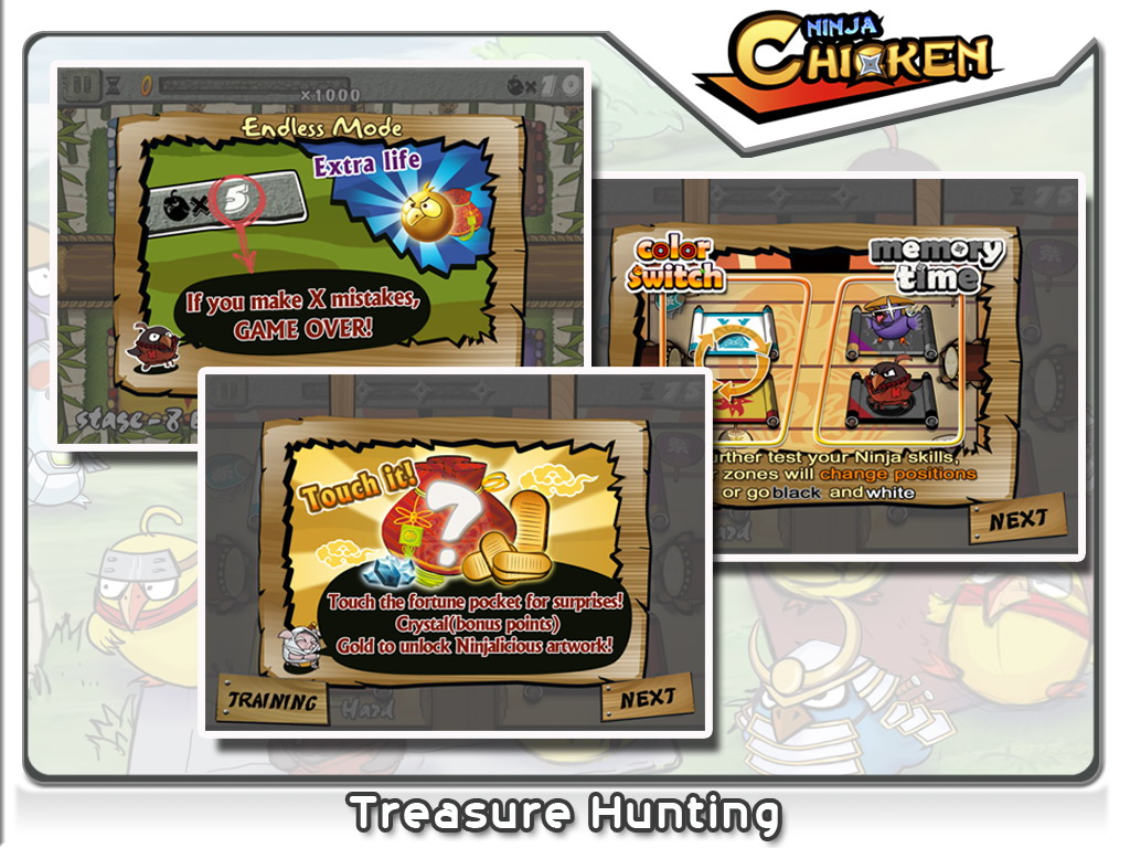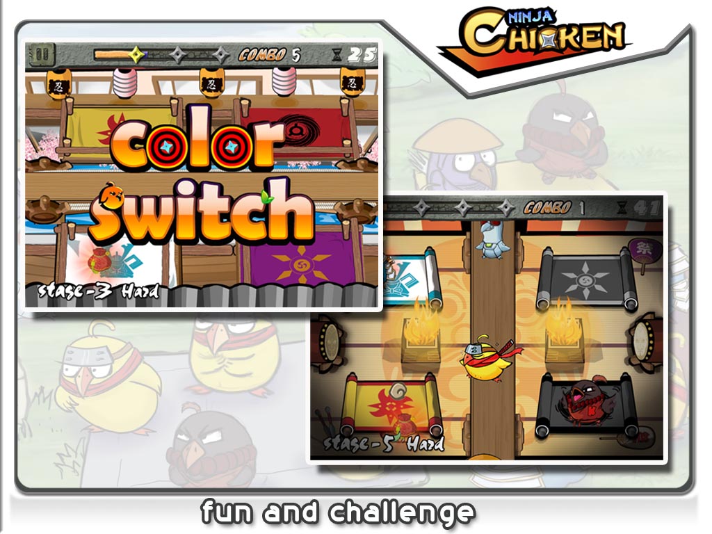 Ninja Chicken resolves to dragging colored Ninja Chickens to their corresponding clan color mat. This sounds really simple and easy at first. Of course, the game cannot be that easy. Ninja Chicken throws in a few exploding robot chickens and pigs carrying umbrellas just to destroy your finger exercises.