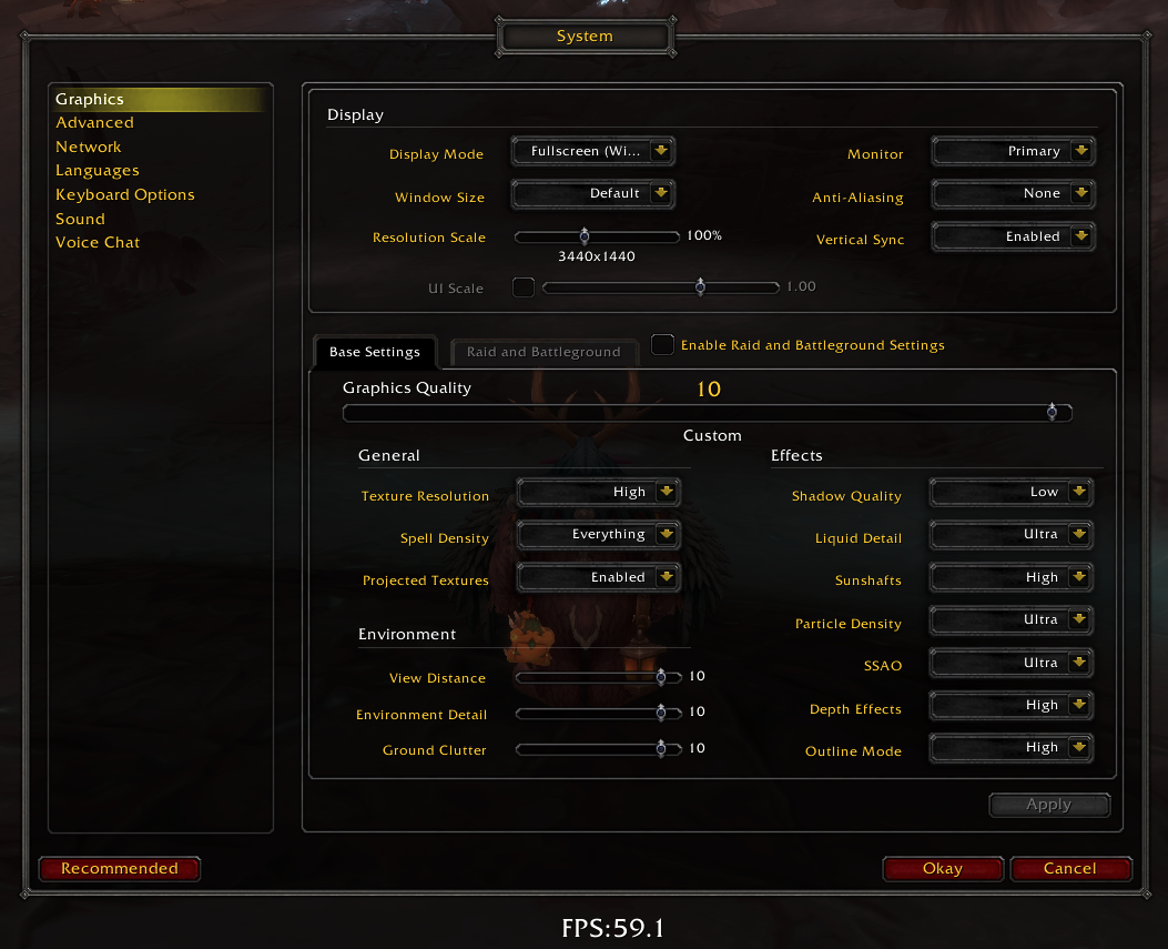 I am using a 3440x1440 monitor, 60hz. On max settings, I can get 30-35fps out and about, in a busier area such as the Stormwind bank it drops to a choppy and unplayable 25fps.