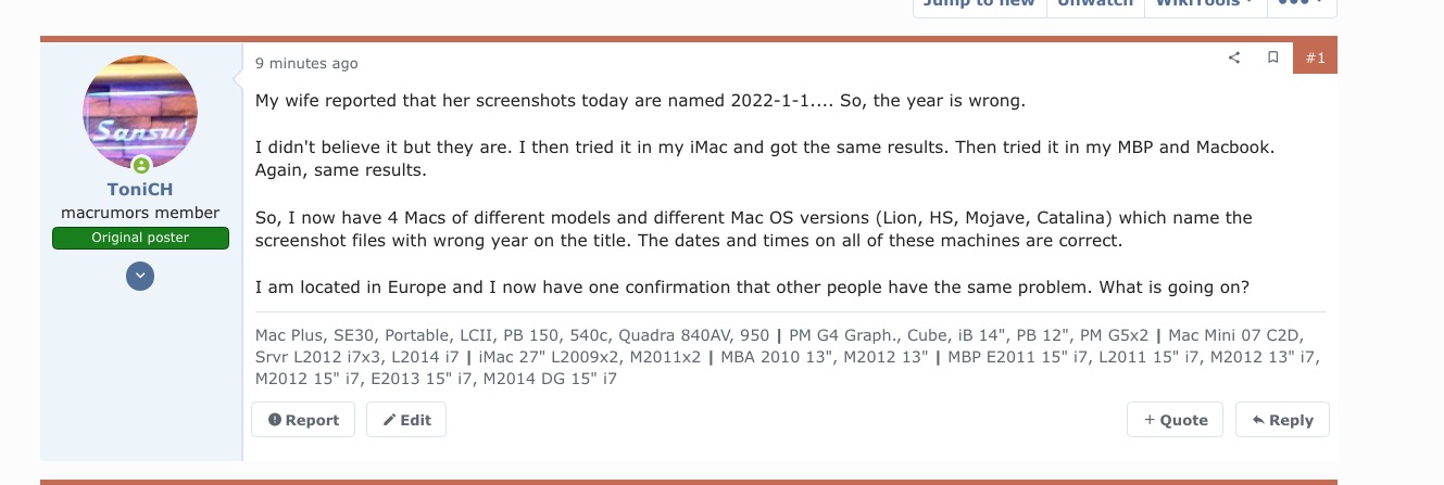 So, I now have 4 Macs of different models and different Mac OS versions (Lion, HS, Mojave, Catalina) which name the screenshot files with wrong year on the title. The dates and times on all of these machines are correct.