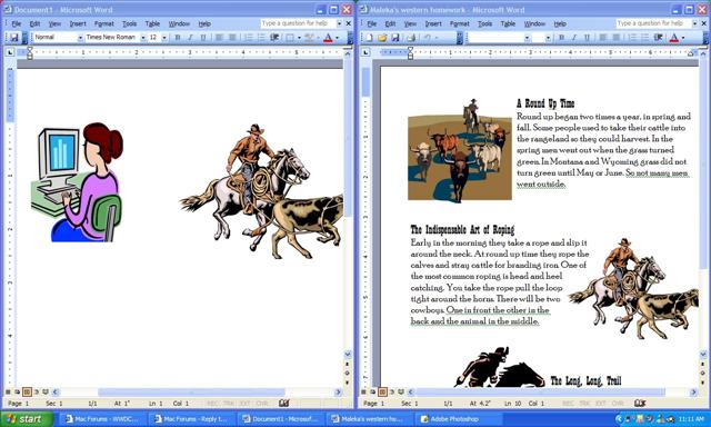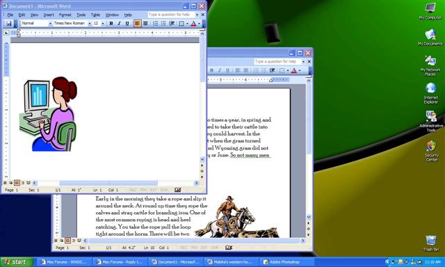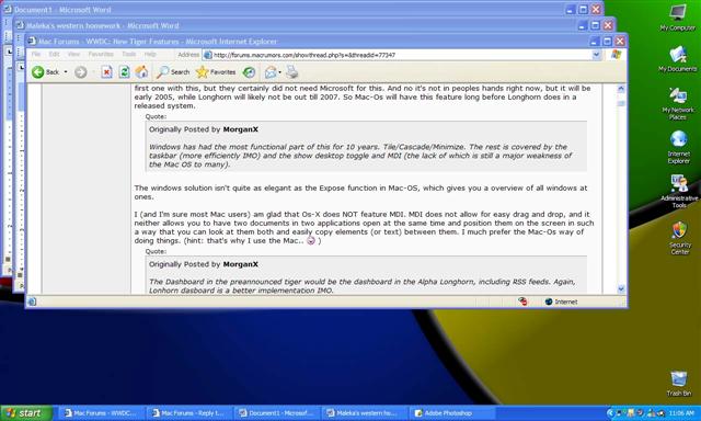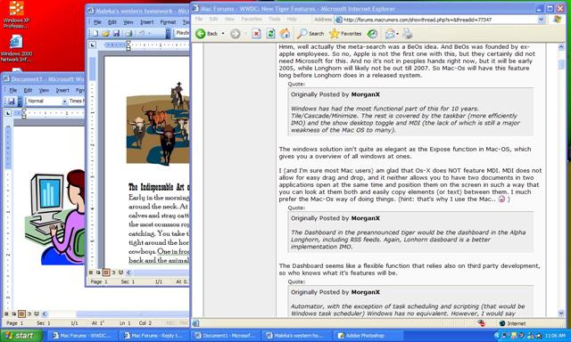 All right I have to confess that I don't use XP that much. So youre right that in certain applications you can put documents side by side. BUT Windows is not very consistent at it. You might like to try the same thing in Excel. I bring this up because I regularly had difficulties using Excel on the PC and not being able to open more than one window at a time. You can do this easily with the Mac version. It appears that you have to re-launch excel to open another window. You can't simply open a new document within the same application, while having another one open. It works differently in other apps like Word. That's not very intuitive or consistent. Anyway I still don't see the benefit of having the document window with the whole menu bar and panels all in one window. It only takes up unnecessary screen space. I only find it confusing and therefore don't see any benefit of MDI. Also the window cascading feature of XP still can't touch the convenience of seeing the content of each open window with one keystroke. Imagine you have 20 Photoshop images open and you want to look at them all at ones while being able to go back to the one you are working in. The cascading/tile feature of XP won't be any good for that. Expose will allow you to do just that with one keystroke. Another thing with MDI is that many (less experienced I guess) users have the tendency to close the applications by clicking on the X symbol of the window while the really only want to close the document. I see my fellow co-workers on PC's doing this all the time when they for instance open a PDF file in Acrobat and then want to close it to open another one. They close Acrobat instead of just the PDF file. So theyre constantly restarting Acrobat to look at different PDF's. Now you might say that this is because they don't use the system in the right way, but what I'm saying is that the MDI system is just not intuitive, otherwise these sort of things wouldn't happen in the first place.MorganX said:I've owned several Macs, and started on Apples. I can tell you I really don't follow you here. The ability to manages open Windows has been one of the biggest benefits of Windows over the years. You have to windows open, position them next to each other and drag and drop. Want it perfect, use tile vertically, or horizontally for spreadsheets and drag and drop. See pics.