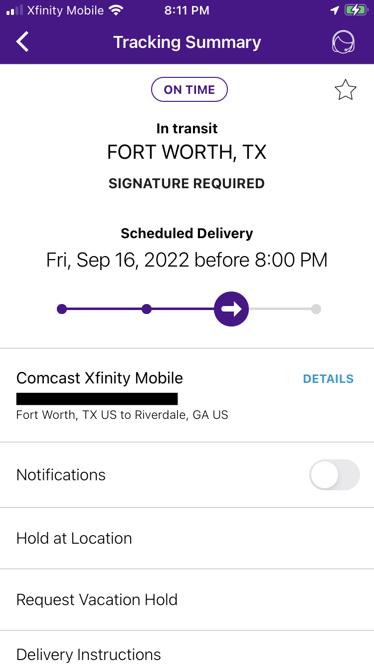 Yeah I agree - FedEx says Saturday Delivery on it. I wonder if Xfinity did that (as it cost extra) since they botched getting us our phones on time. I have received a lot of packages from FedEx on Saturday before but you do have to mark it when shipping. So I know they for sure do it, you just have to specifically mark it and it appears they clearly did because it says it on the tracking page.Yeah, I don't think Xfinity Mobile site is accurate (or up to date). I just got a shipping notification in FedEx that my 2nd phone (Black 256 Pro) is shipping out tonight, with delivery date on Saturday. My wife's Purple 256 Pro is coming tomorrow, which seems like a trend here (Blacks shipping out later than Purples). I trust FedEx on this one if their own tracking website says Saturday delivery.