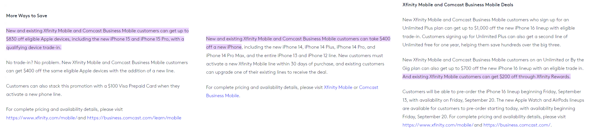 New Xfinity Mobile and Comcast Business Mobile customers on an Unlimited or By the Gig plan can also get up to $700 off the new iPhone 16 lineup with an eligible trade in. And existing Xfinity Mobile customers can get $200 off through Xfinity Rewards.