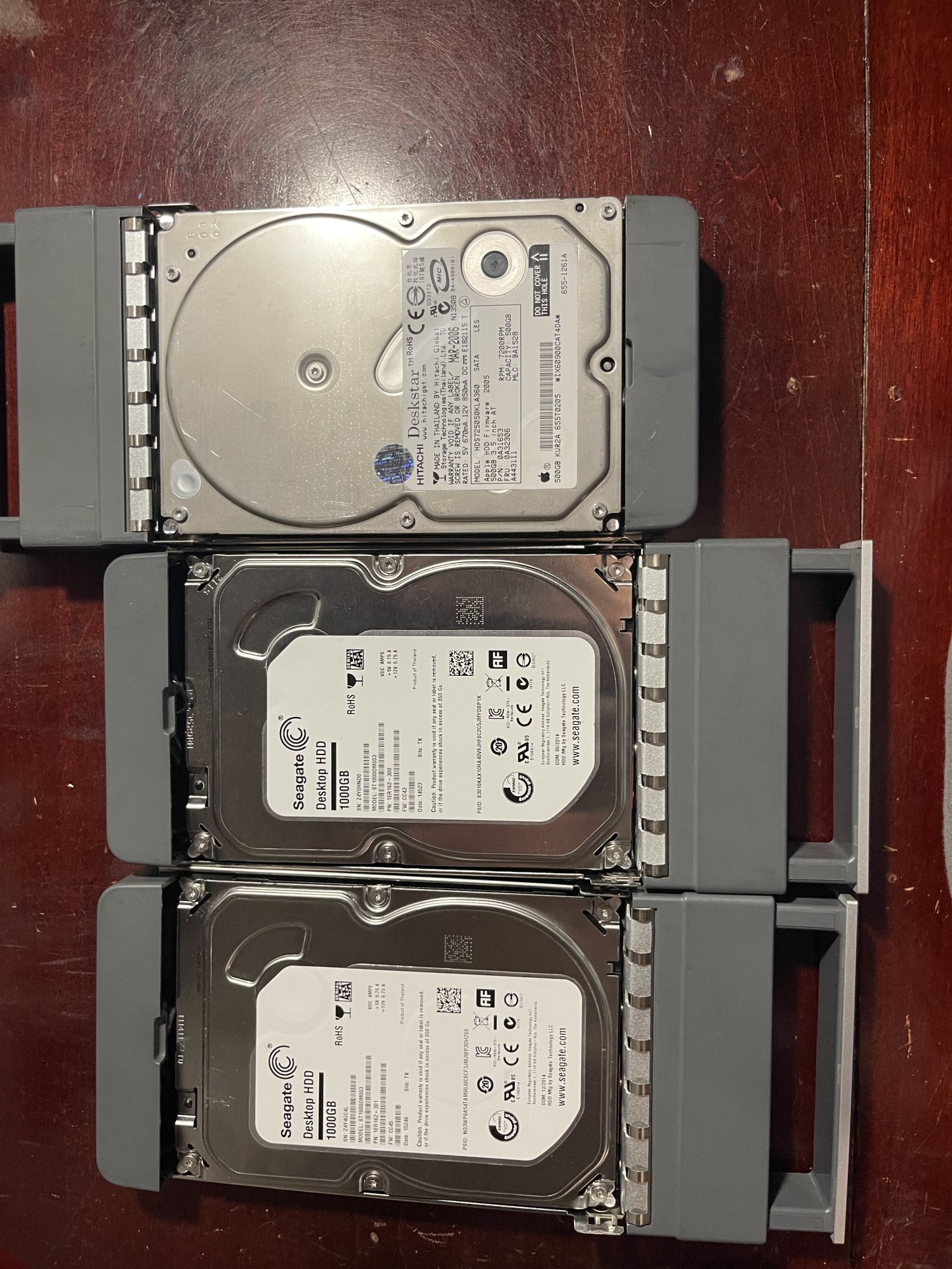 I have included pictures which show all 3 drives and the caddies they are in. The 500GB is in the 80GB caddy and the two 1TB are in the 750GB caddies. I have tried swapping around the drives in the caddies, with the 500GB drive working in all 3 caddies and neither of the 1TB drive working in any caddy.