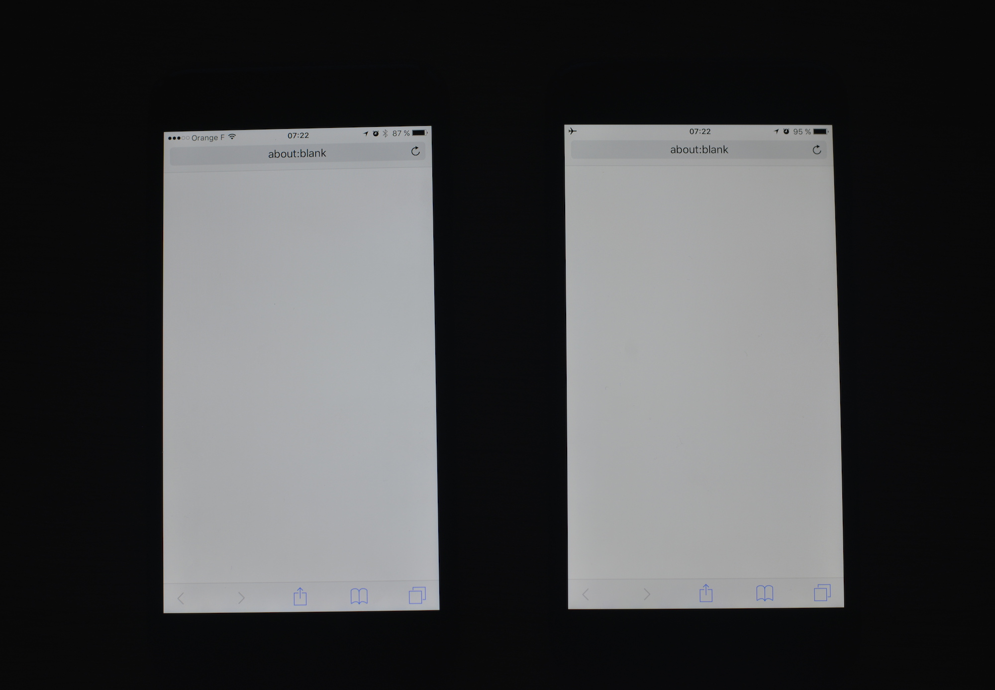 This is my iPhone 5S (left) compared to my iPhone 7 (right). Both at maximum brightness and auto brightness off. Picture taken with my D500 in RAW format. A WhiBal gray card is included to set the appropriate white balance in Lightroom. I measured both screens with my ColorMunki Photo and Argyll. The result was 7686K for iPhone 5 vs 6945K for iPhone 7, both higher than the expected D75 and D65 calibrations.