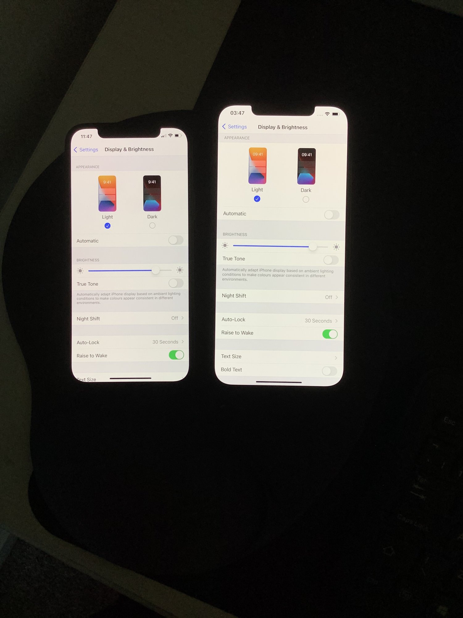 All of these are iPhone 12's, and one of them has a screen that is displaying content as it should. This is not an intentional warming, a move to 6500k white point, glue, or any other myth. This is a physical yellow, green, or pink tint layer that distorts all colors, washes out text, reduces contrast, and looks terrible.