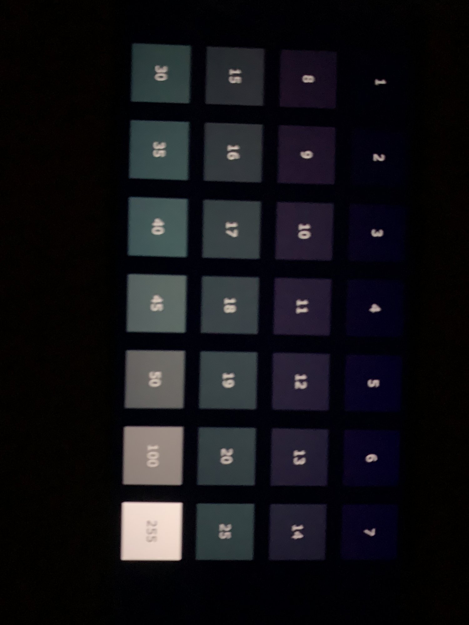 very dim gray, not bright enough to read the number.Watch the attached video in a dark room and reduce your brightness to zero. What color do the brightest keys on the video show up as?