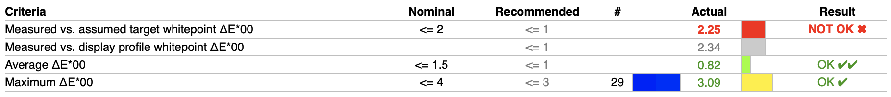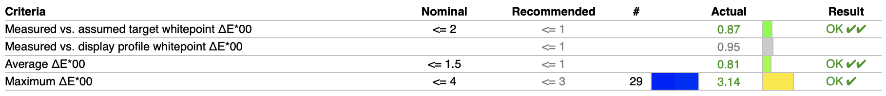 Lacking that, I wouldn’t place too much weight on sub-deltaE deviations in the absolute values. Relative differences and changes over time (e.g. November vs. now) are probably accurate though (unless it’s years between measurements, because colorimeters also drift over time).