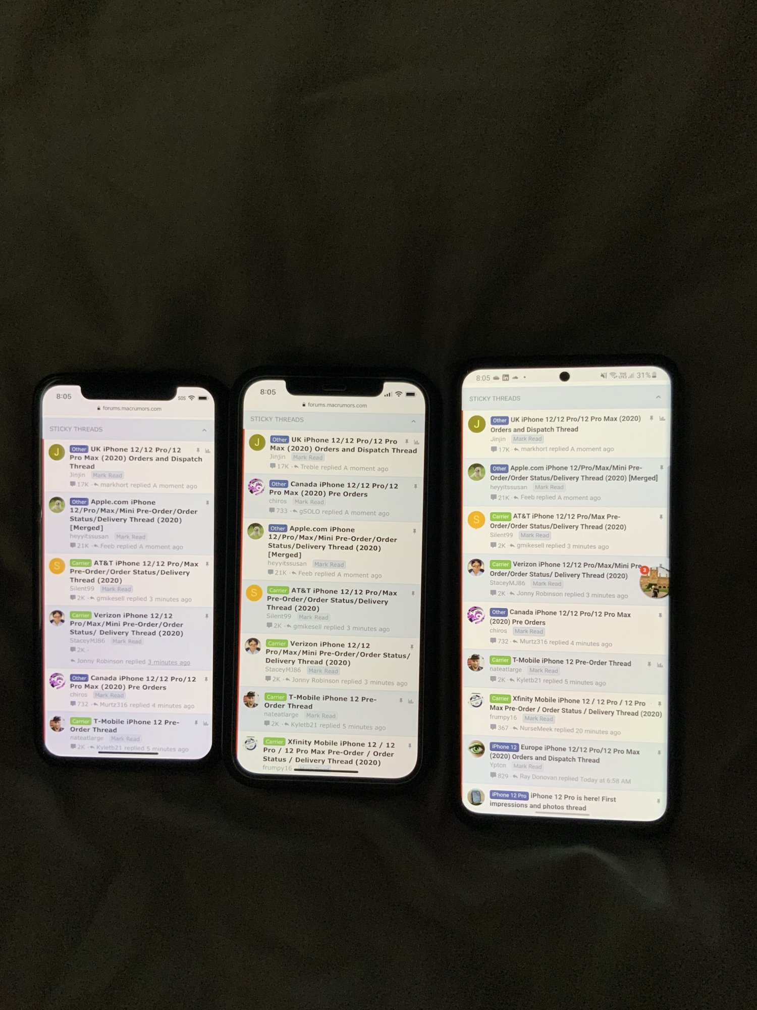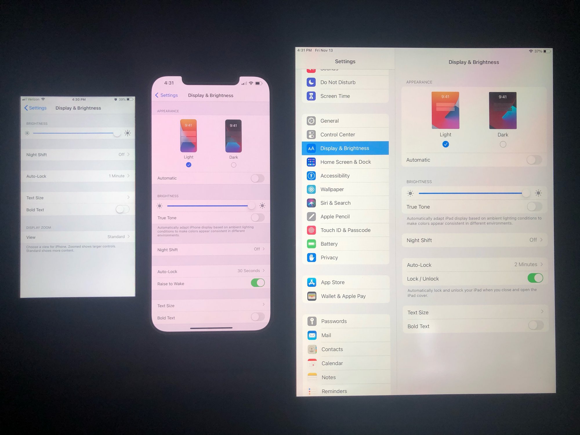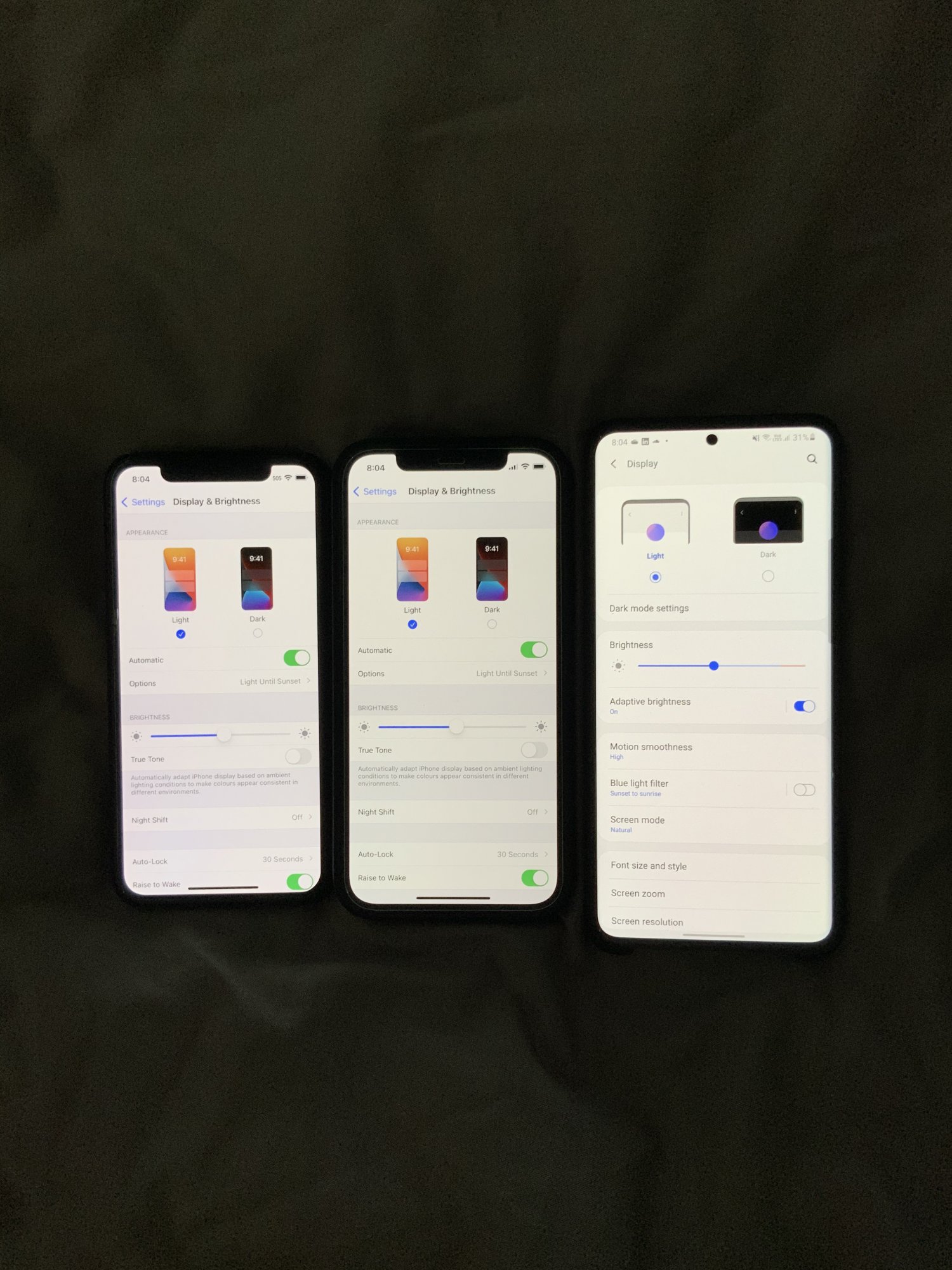Full brightness, true tone off, auto-brightness off. Same settings on all phones.