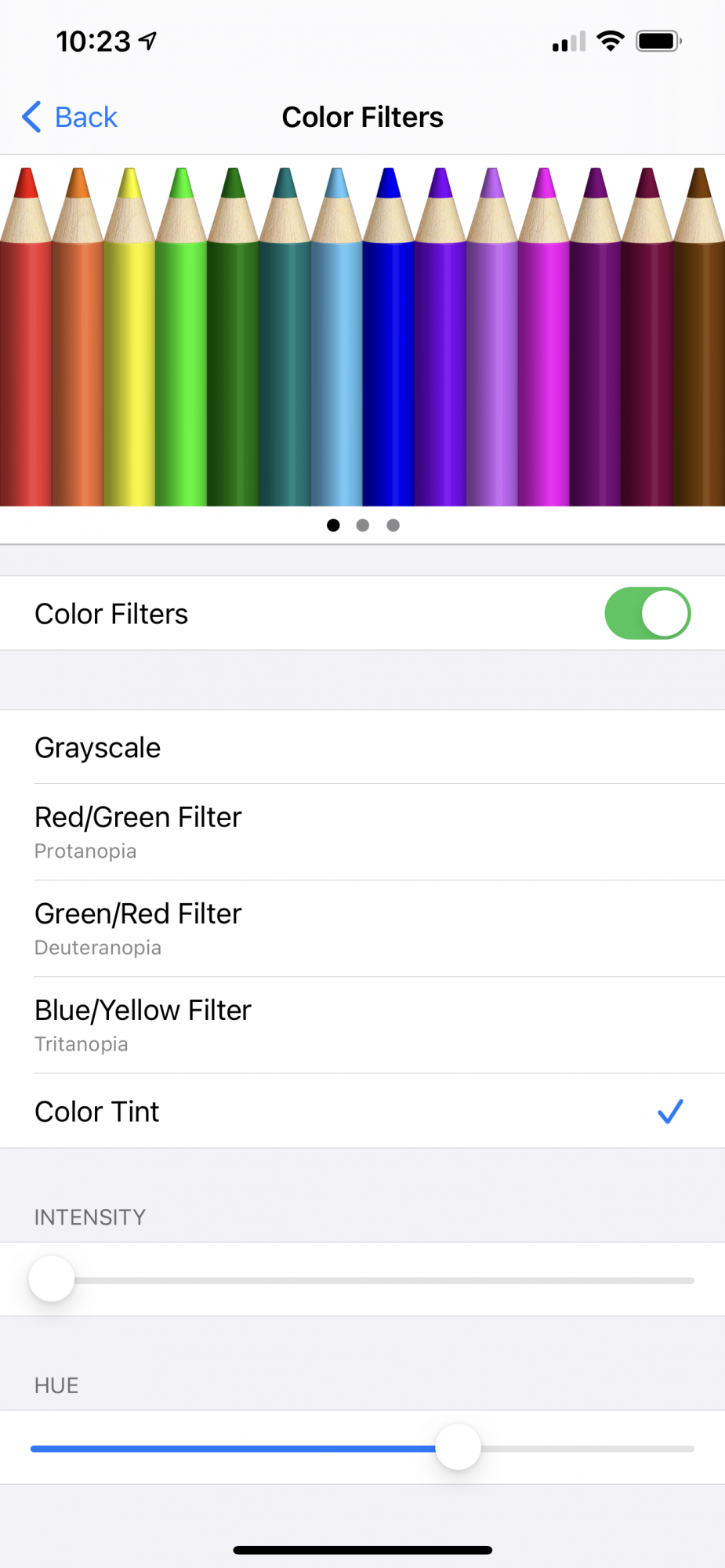 I sat down last night and started playing with it, mainly to get rid of green tint, not just to make my screen cooler. First I tried the tint slider all the way to the left under the red pencil, and that made the screen a bit more red and got rid of the green tint, but it made the screen too warm. Then I tried moving the tint slider under the dark blue pencil, and that made the screen a lot cooler, but didn’t do anything to fix the green tint. Finally I tried moving the slider to the dark purple pencil, which added a bit more red to the blue, and that neutralized the green tint. Then I started comparing photos, websites, and color charts to my 2019 iMac, and I was able to really dial in the color tint slider to where my 12 Pro Max matches my iMac screen almost perfectly. Seriously, it’s almost indistinguishable. I’ve never had a phone that matched my computer screen so closely before. Here’s that setting. The intensity slider is set all the way to the left. I turned my screen this way and scrolled to make it easier to see where the tint slider is in relation to the pencils.