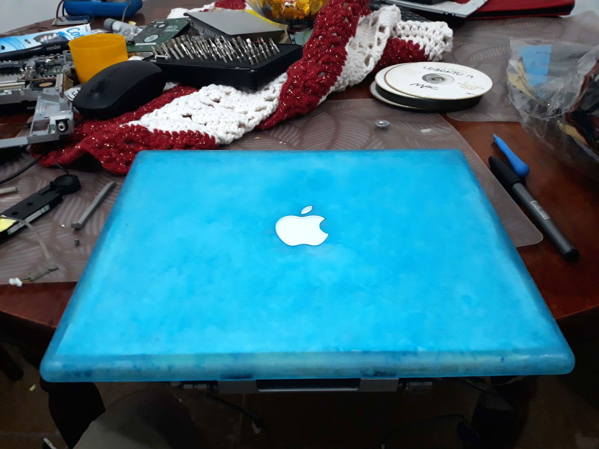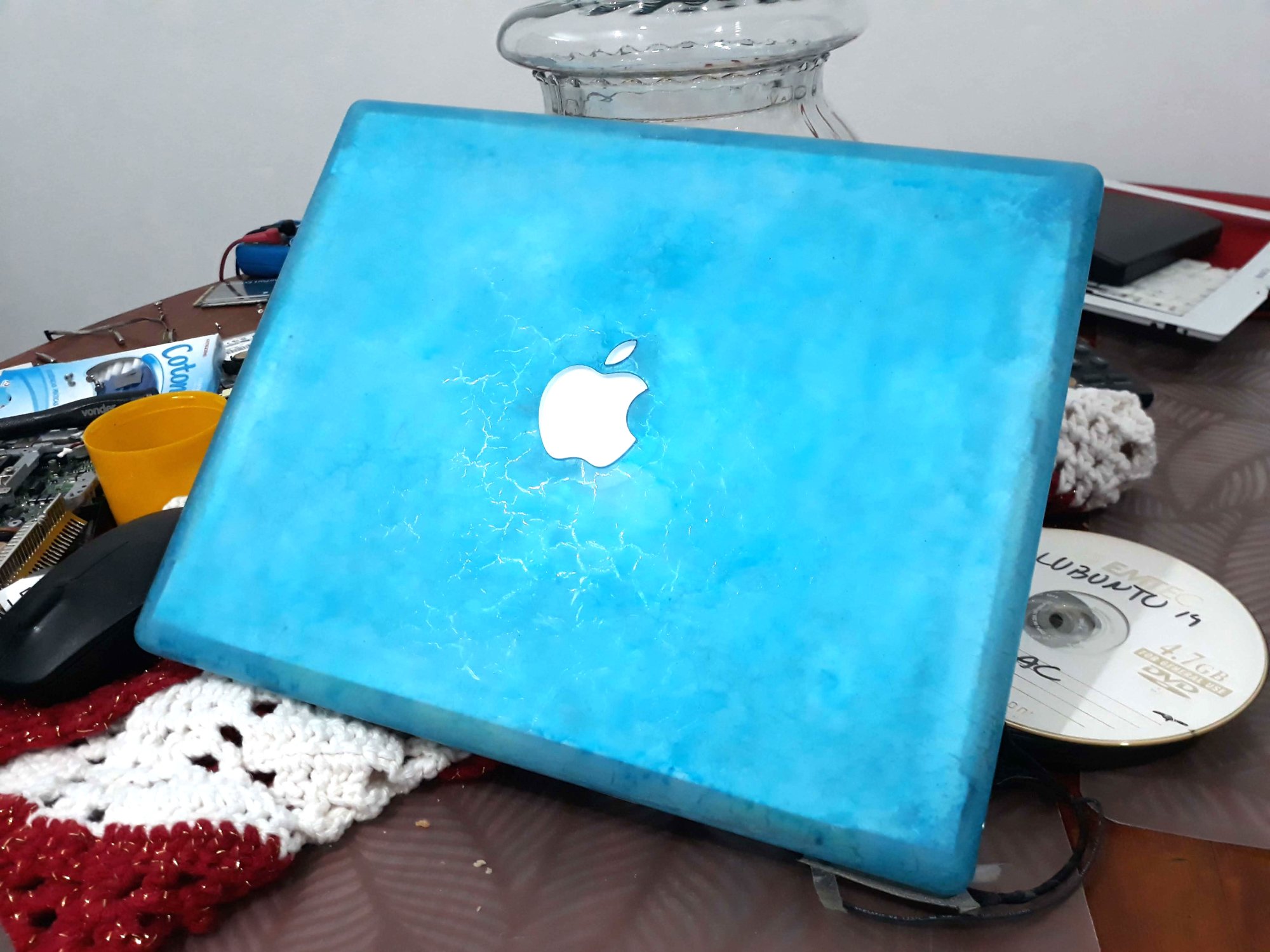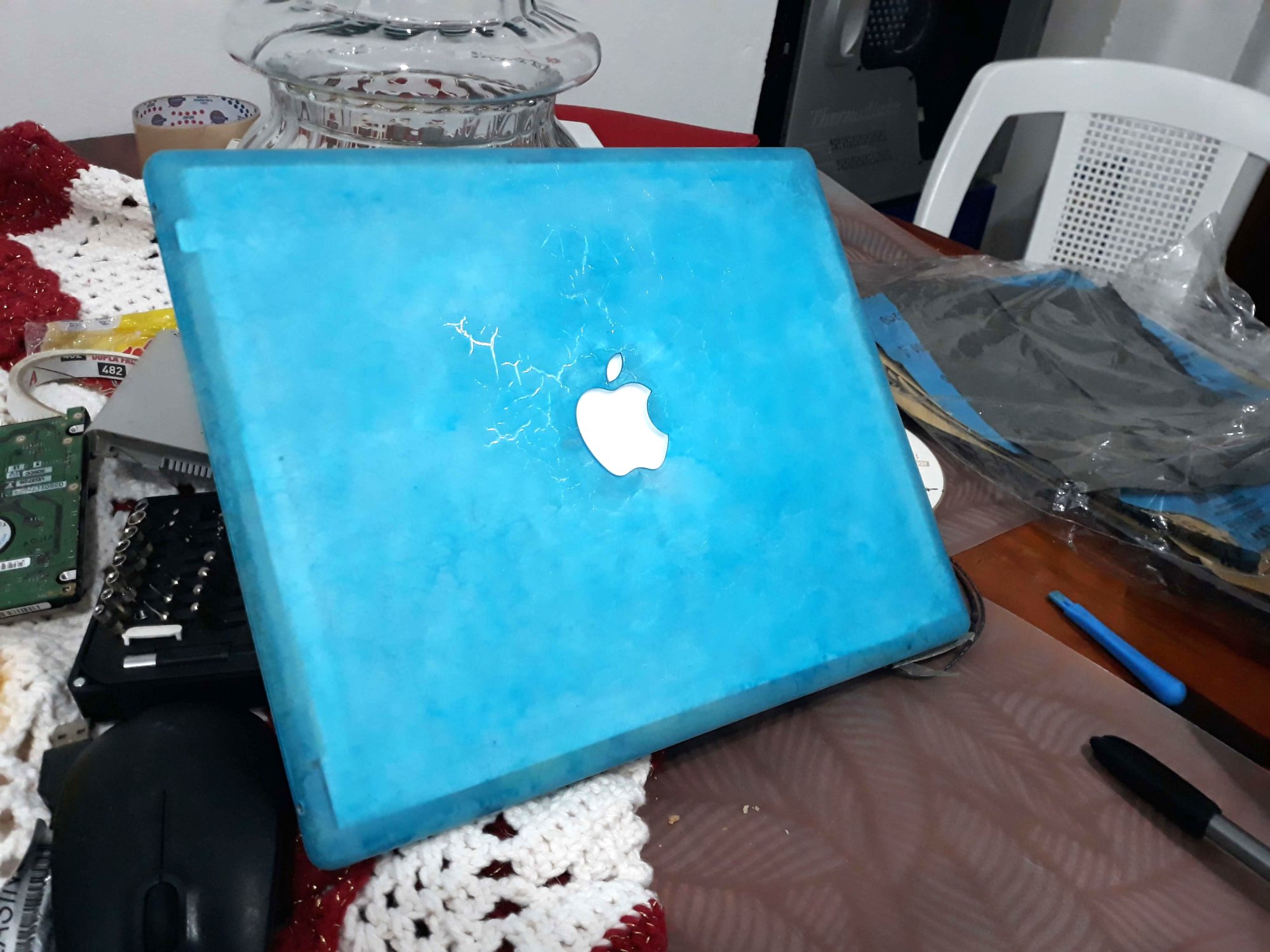 I was wondering what to do with this ibook g3, I got it with a bad lcd, I took it apart but I wasn't careful, and the lcd cover ended up scratching from the inside, damaging the white paint. Then I tried to paint with white spray but it didn't look good, so I tried to remove the spray with paint remover and thinner, and that ended up giving me a frozen effect, with "rays" that can be seen in some light angles. I know it's possible to make it transparent like glass using ethanol or isopropyl alcohol, but that wasn't my intention initially. So, I liked the frozen effect, and I decided to go ahead, and give the inside a blue color using blue stained glass varnish, I used a sponge to create a smoky effect like clouds in the sky, then I assembled everything, and I realized that the interior of the apparent lcd with all that metal and cables, it was ugly. So I cut out a regular A4 sheet, and put it inside. I also removed the white apple logo diffuser, as the A4 sheet does the same job.