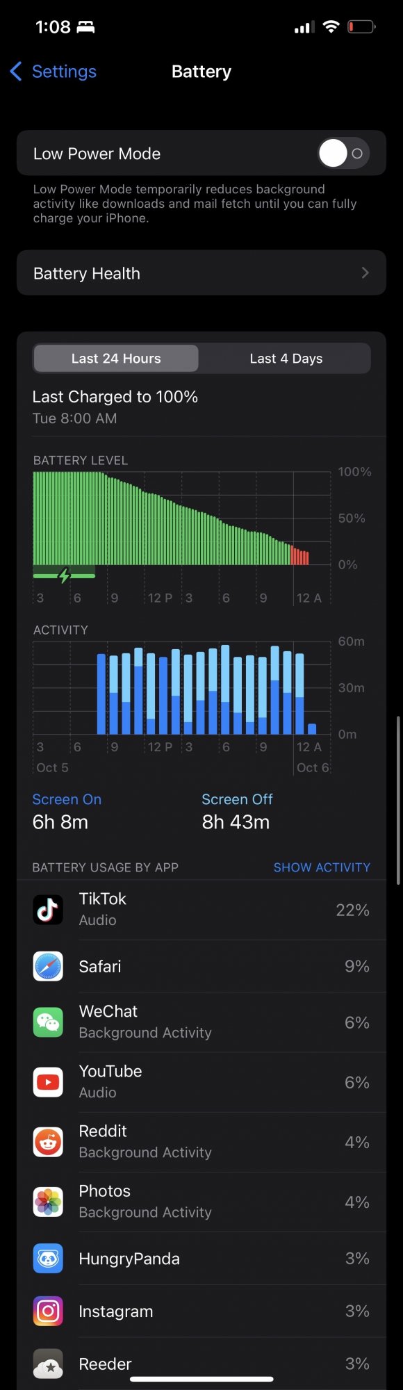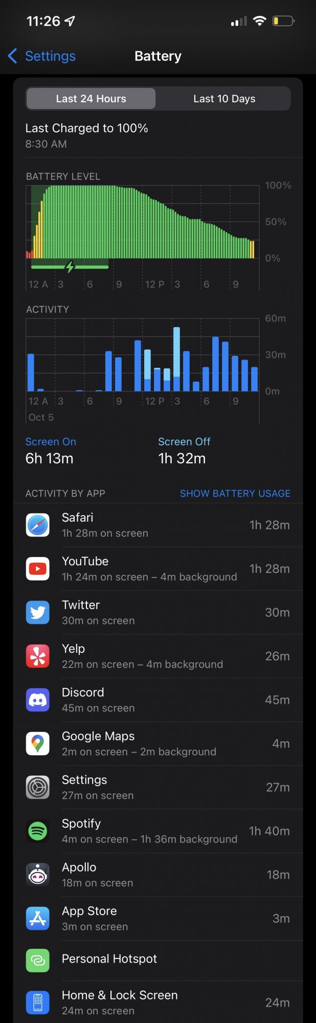 Here's less confusing data from the past 12 hours. Took it off the charger at 9 am and now it's midnight and left with 9% battery left. Less than 5 hours screen today, this is unbelievable. My iPhone 11 Pro with 85% battery life can do better than this.