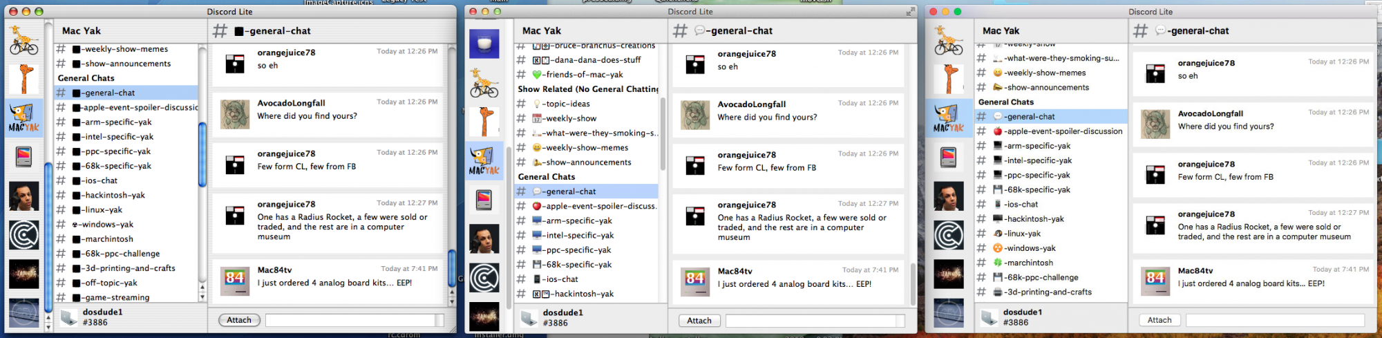 Wow, I just stumbled across this thread. I had no idea there was someone else working on such a thing. My approach is definitely quite a bit more complicated (and VERY time-consuming), as I'm writing the entire application from scratch using native Cocoa/Objective-C. As such, though, it runs VERY well, even on the anemic 1.33 GHz 12" PowerBook G4 I'm using for testing, with 768MB of RAM. I'm at the point now where about 70% of the functionality is there. I was able to get around all the SSL issues using some (very bad practice) hackery (which you'll see in the GitHub repo when I make it), but hey, you gotta do what you gotta do, right? Anyways, with that said, if any of you all want to test what I have done now, just let me know, and I can send you a copy. Just be aware it is not fully implemented yet. I do plan on this being an almost fully-featured client once I'm done (including voice and even video if I can squeeze that out of it). If you want to try it, your account must not have 2-factor authentication enabled, nor have a captcha requirement (as those features have not been implemented yet). Lastly, I didn't design this application exclusively for old systems. I designed it to work on all Macs, modern and old, as I despise the bloated Electron-based garbage that is the official Discord client. As such, I was able to compile this as a "tri-FAT" binary, with native support for PPC, 32-bit Intel, and 64-bit Intel. I do plan to make it a "quad-FAT" binary later, and add native ARM/M1 support (if I can manage to pull that off).View attachment 1903164
