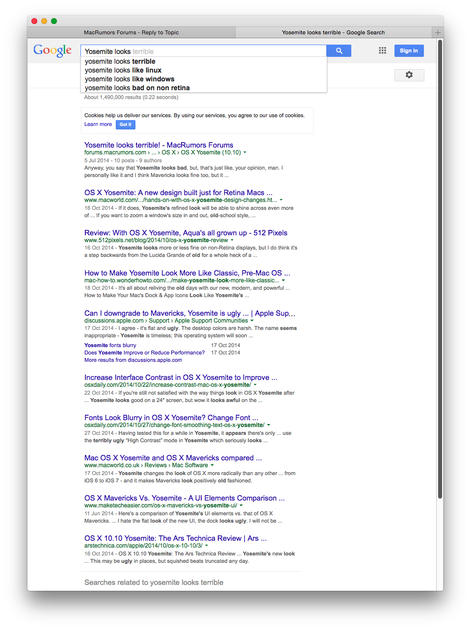 Now I don't know whether things like that search box with almost identical grey upon grey contrast was Ive's doing or a design member's doing, but Ive is responsible for APPROVING it. Someone isn't doing their job. Even if I don't agree with the overall new "look" of Yosemite, it shouldn't have glaring readability and usability issues which changes like that create for the user. That SAD thing is they are simple to fix. Change the damn color! It isn't rocket science. I almost feel color blind looking at Yosemite in places.
