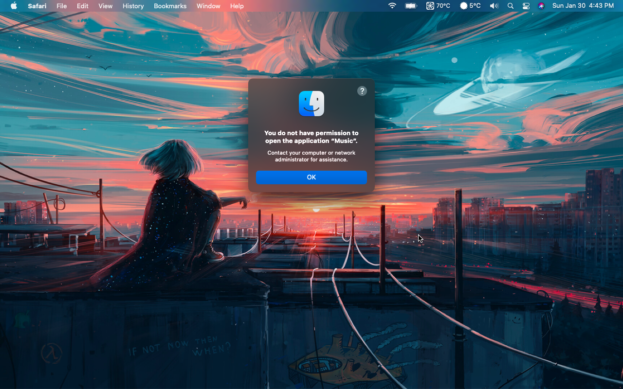 Hey folks. Quick question for you. I'm running BigSur 11.6.3 on the MacBook in my sig, and everything is great, but I am running into a permissions issue. As the thread title states, I'm getting a permissions error trying to open the Music app. But here's the weird part. The first time I try to start the app, after a cold reboot, it works. But then it never opens again. Log out and log back in doesn't help.