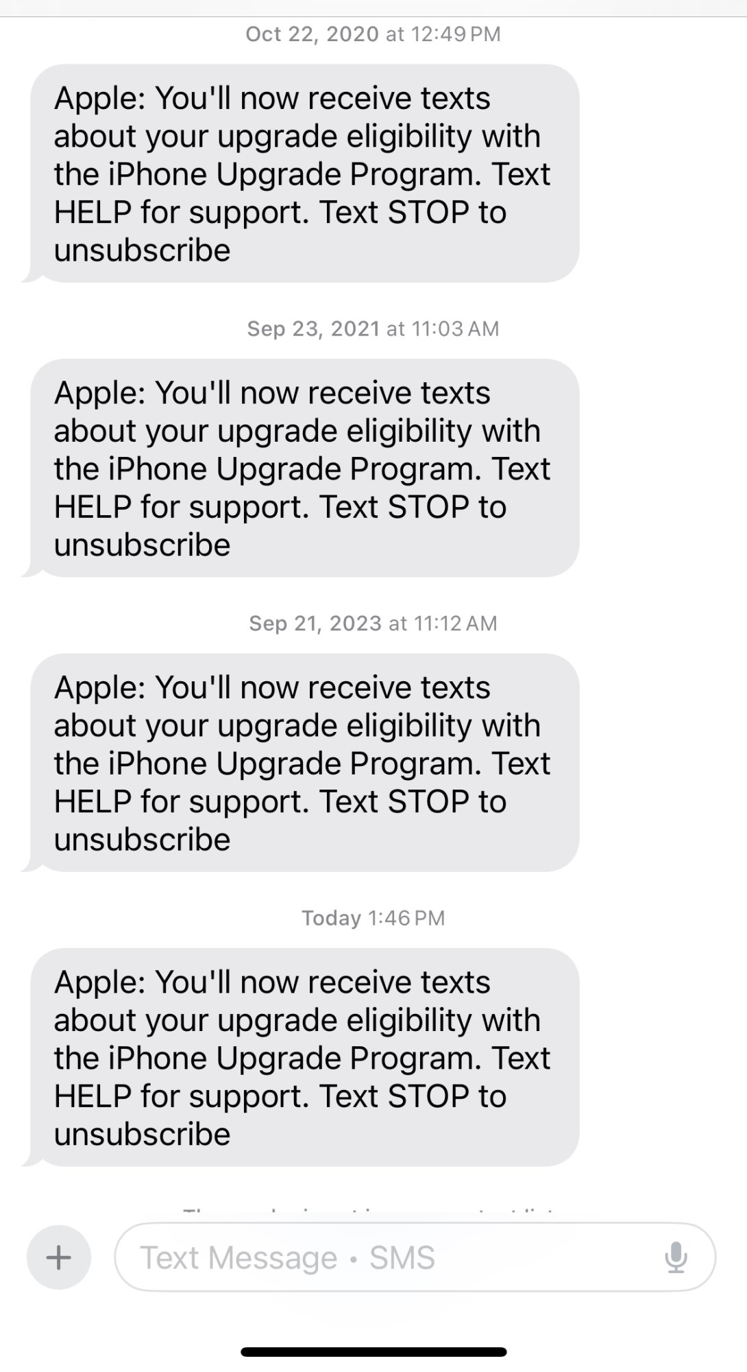 Yeah, but they never do. In all these years, I never get text messages about upgrade eligibility, the status of my account, payoffs, turn ins, nothing. Thats my point. I just get the same text once a year. Why bother?