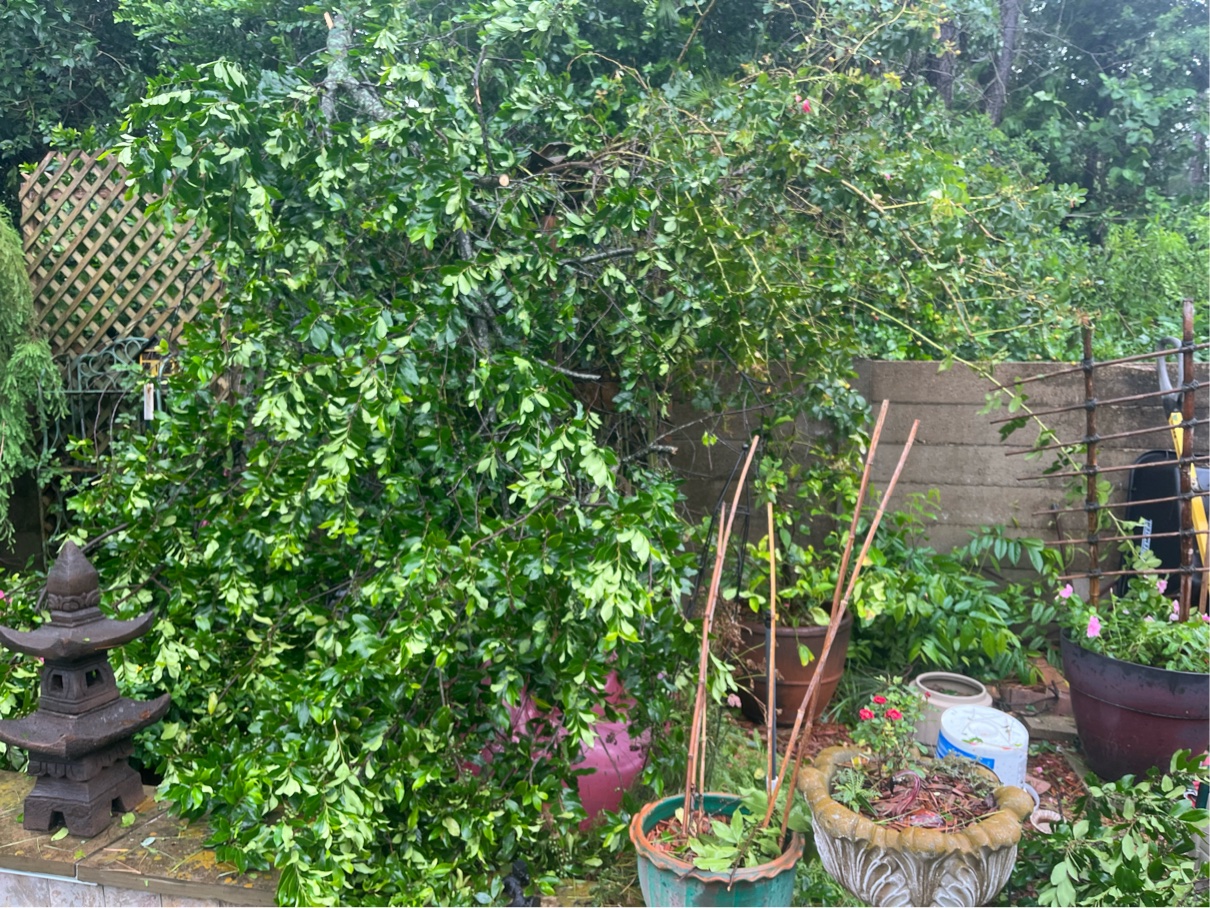 Tropical jungle cement pond. That’s not a down tree on the right but our weeping cedar.