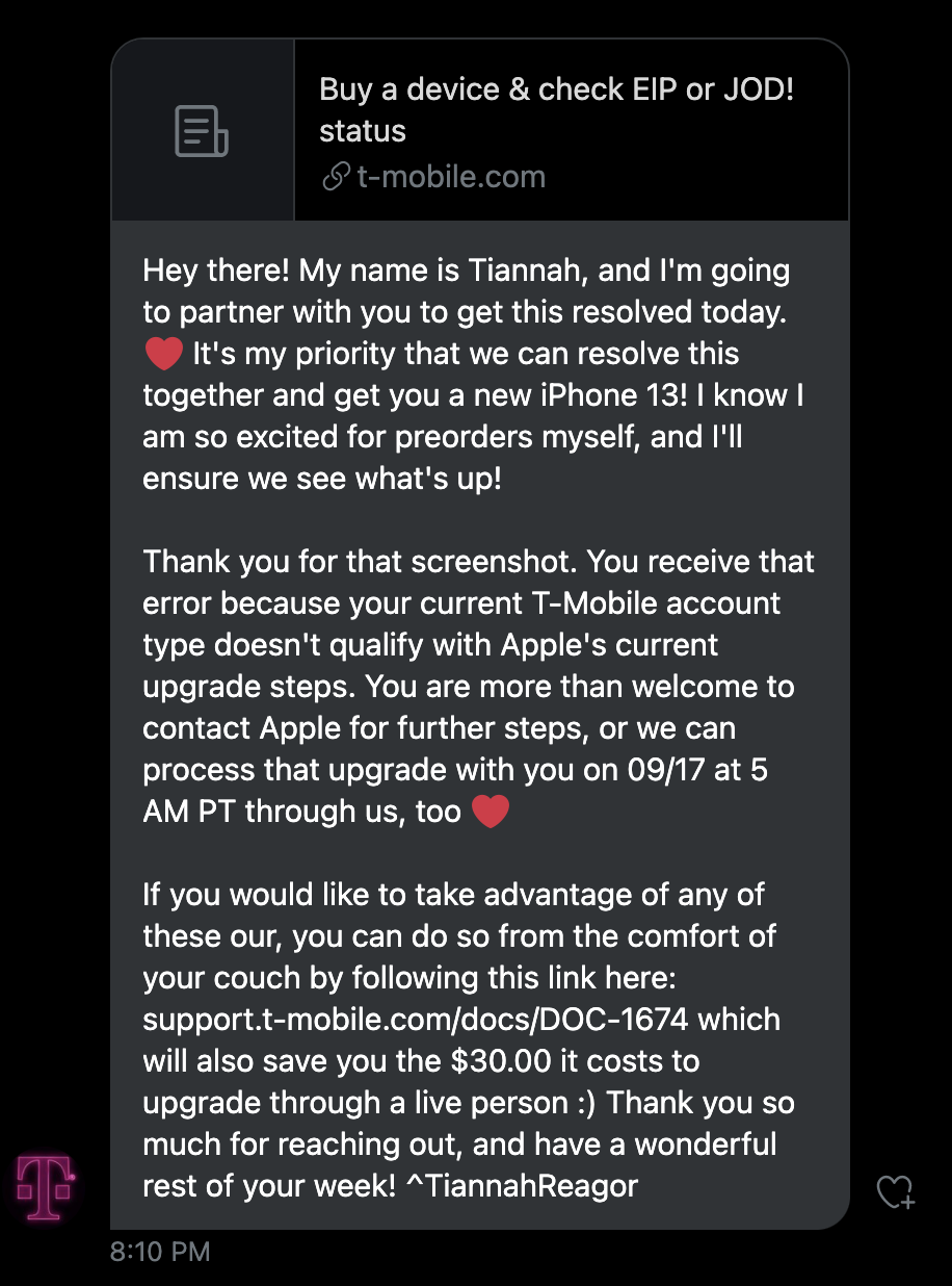 I’m also getting this error during the IUP process. My running theory is that it might be related to turning on T-Mobile’s Account Takeover Protection after the breach (if anyone here is getting the same error and didn’t turn it on, please chime in).