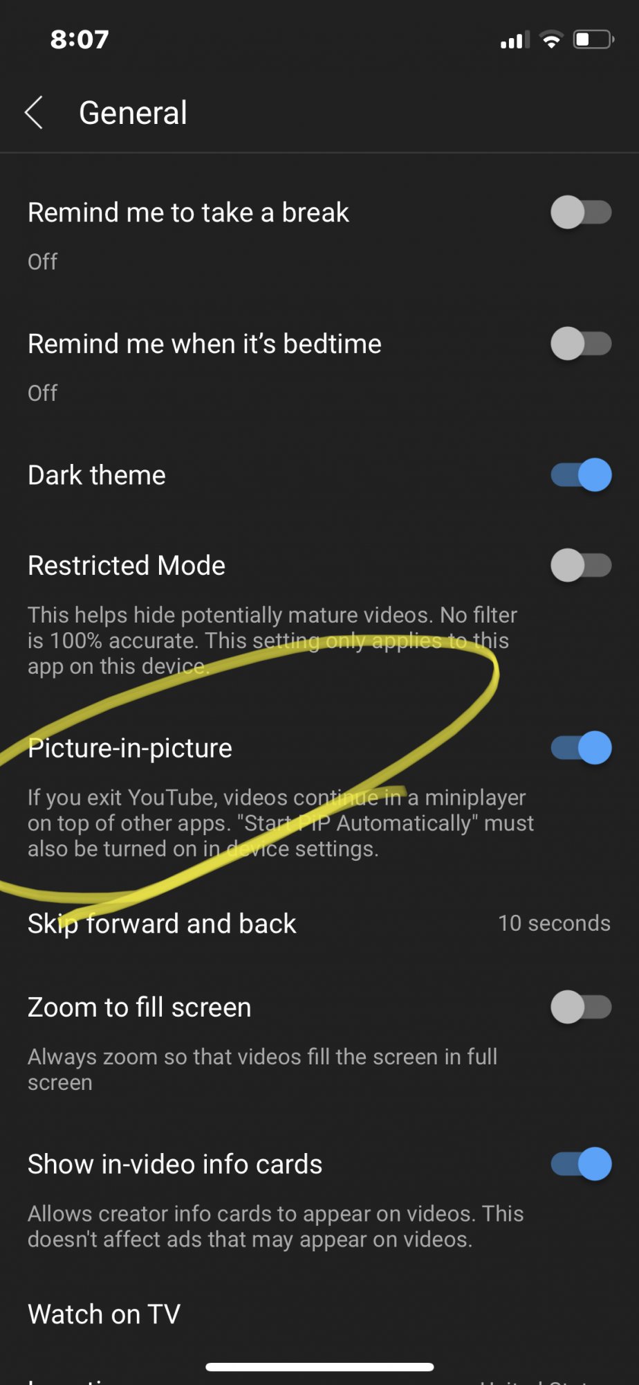 My settings are missing that toggle. Go figure.The PiP is still working for me on the latest update. Maybe check the setting. I don’t think I’ve had that before.