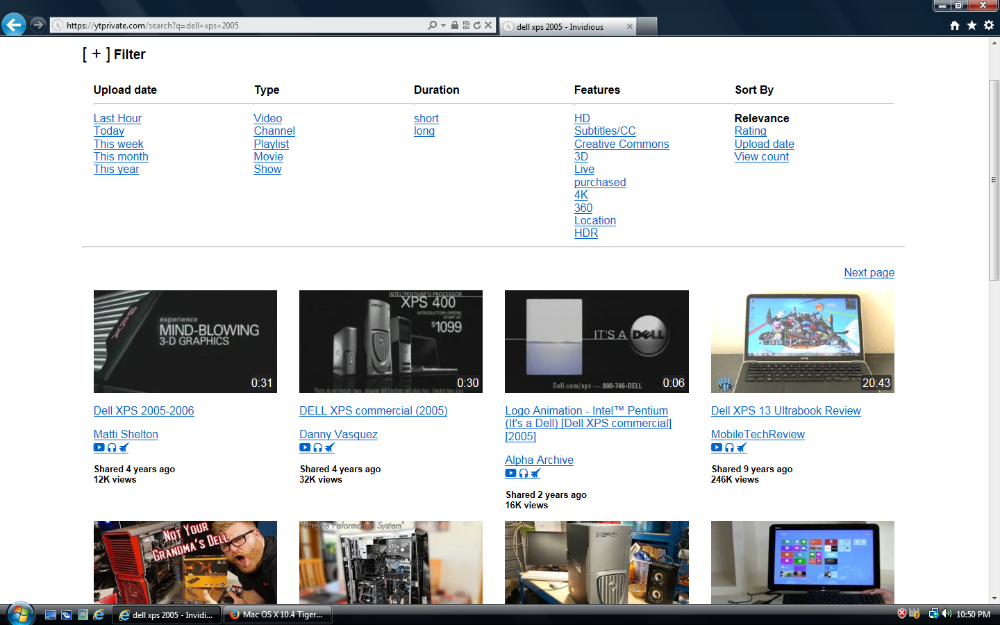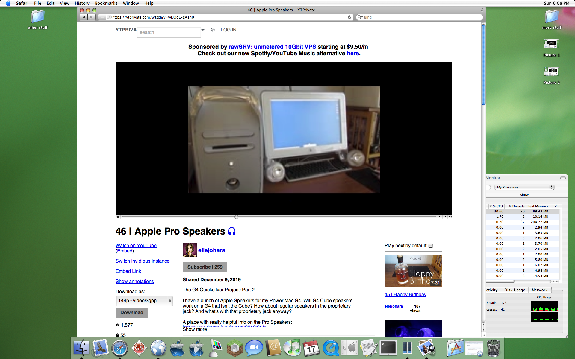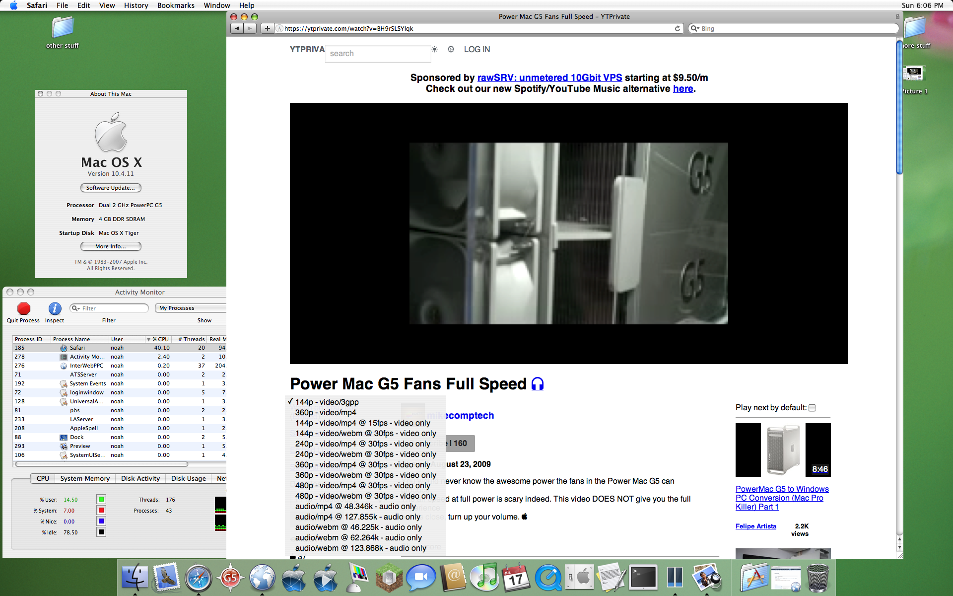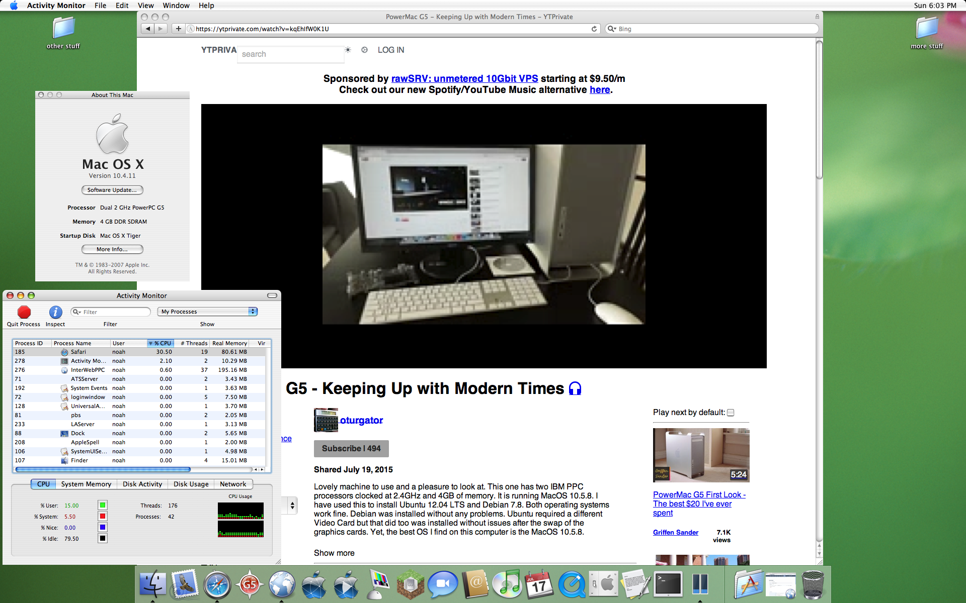 Video playback usually hovers around 30% to 40% CPU on my DP G5, which I'm sure will still be quite watchable on even a low-end G4, especially if their downloadable 144p/3gpp videos are leveraged. All-in-all, browsing around feels similar to how YouTube used to be back in the day, with comparable performance.