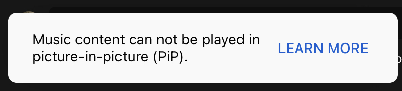 All I get when I swipe up to get to the Home screen from YouTube app is the app just disappears (like any app normally would) and there's no PIP video content.Gave it a try — no matter the video, it doesn't work and when I switch back to the app I get a "Music content can no be played in picture-in-picure." 🙄