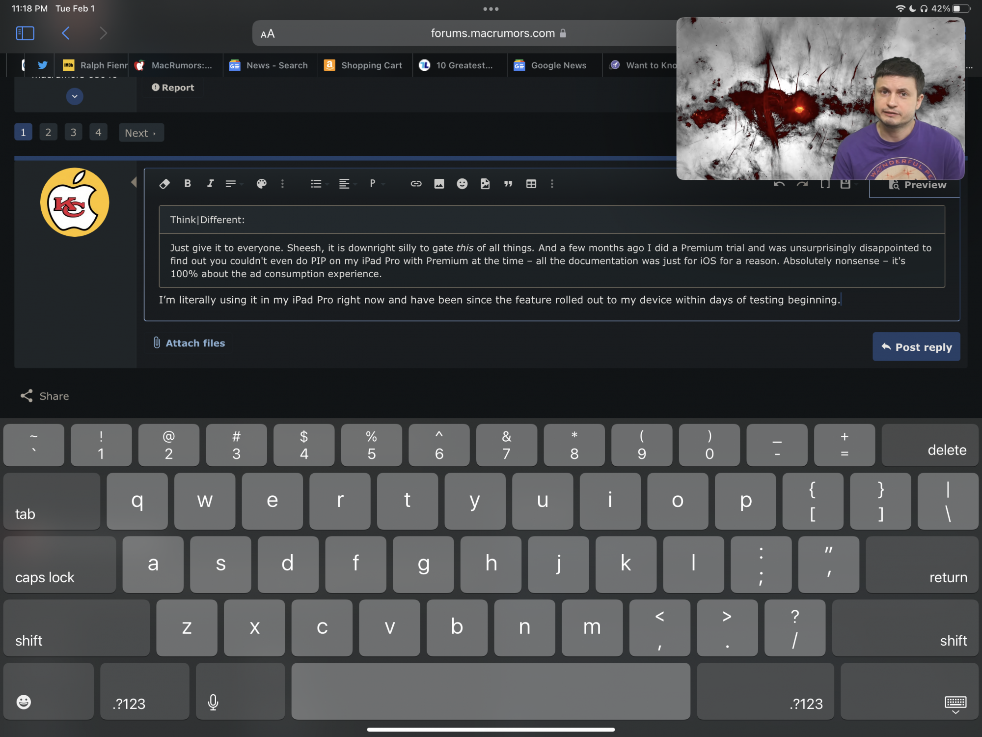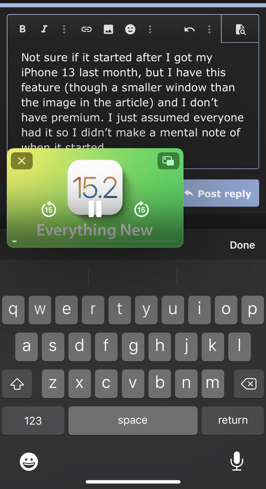 I’m literally using it in my iPad Pro right now and have been since the feature rolled out to my device within days of testing beginning.Just give it to everyone. Sheesh, it is downright silly to gate this of all things. And a few months ago I did a Premium trial and was unsurprisingly disappointed to find out you couldn't even do PIP on my iPad Pro with Premium at the time – all the documentation was just for iOS for a reason. Absolutely nonsense – it's 100% about the ad consumption experience.