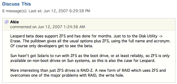 Informationweek followsup on their previous quote that ZFS was not on Leopard. Croll, senior director of Mac OS X Product Marketing, clarifies: