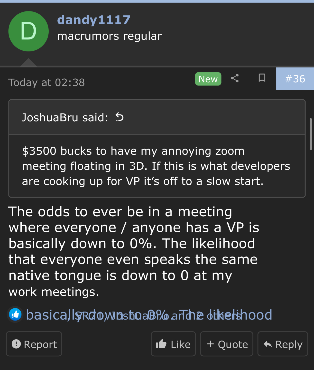 I wonder if there are merits to being able to zoom without having to be tethered to your desk. Like you could join a zoom session from your Vision Pro, and listen in while moving around the building, hands-free.